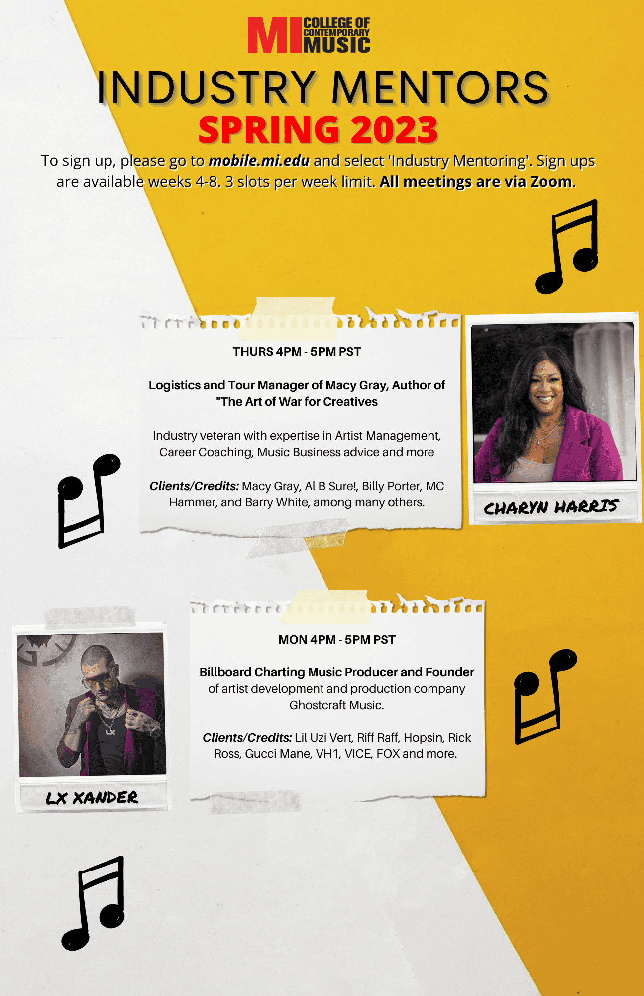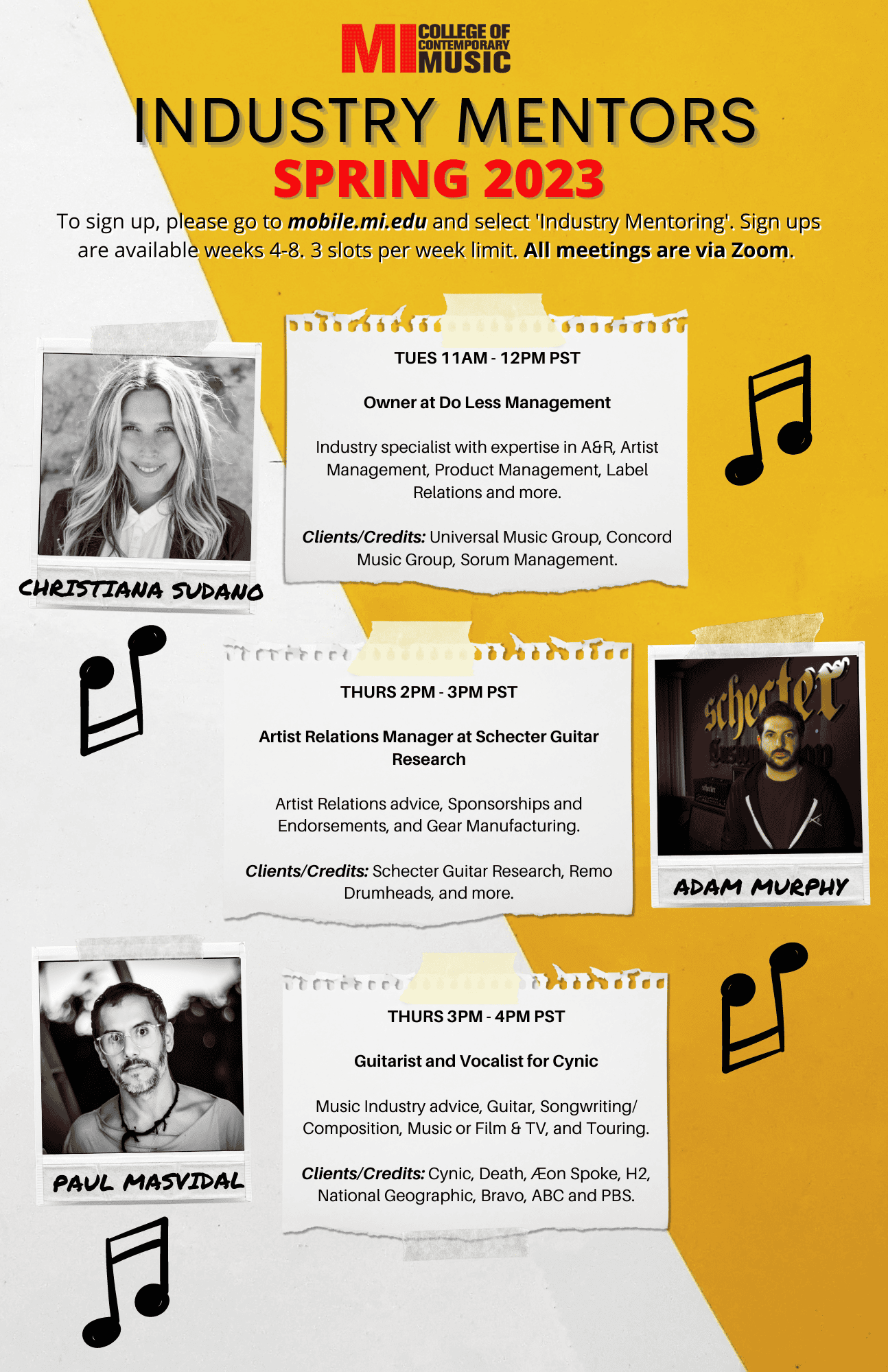 Musicians Institute is proud of our diverse mentor program, which allows MI students the unique opportunity to speak one-on-one with leading professionals who are working and thriving in the music industry. Each quarter, we feature a new group of MI instructors and industry professionals who specialize in different areas of the industry. Our mentors have won Grammys, produced hit songs, worked with some of your favorite artists, and some teach at MI!